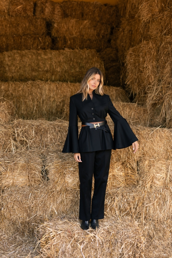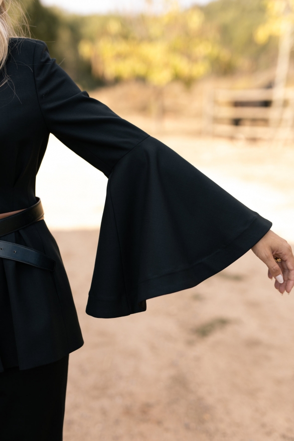 BLAZER COM DECOTE SUBIDO, SEM GOLA E VIRADO.